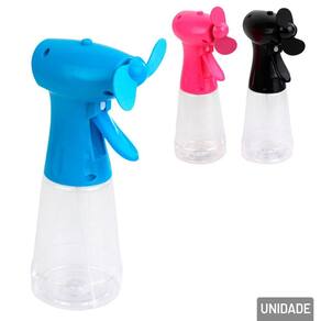 Mini Ventilador e Borrifador 350ml á Pilha C Mini ventilador e borrifador em plástico.\nIdeal para os dias mais calorosos.\nCapacidade de 350ml.\nUtiliza 2 pilhas AA (não inclusas).\nLeve e compacto.\nMedida aproxim.: 21x7,5cm.\nDisponível nas cores: Azul, Preto, Pink.\nEspecificações:\nMarca : C3B\nTipo de material : Plástico, ABS\nCores ou Estampa : Color\nDimensões do Produto : 62 X 8 X 10 CM\nDimensões da Embalagem : 22 X 10 X 8 CM\nPeso Bruto (Gramas) : 0.166