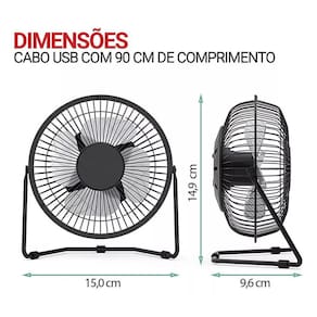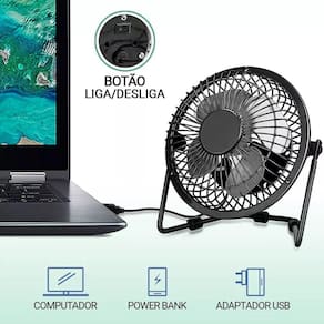 Fácil de montar e instalar e, com sua conexão usb, você poderá conectá-lo diretamente em um computador, notebook ou à rede elétrica com um adaptador de conversão ubs bivolt. Com suas pás feitas em metal você será capaz de desfrutar de um produto de alta qualidade e durabilidade. Seu estilo único se destaca em qualquer âmbito devido ao seu ótimo funcionamento.