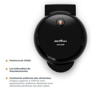 Mini Waffle Maker Britânia com chapas antiaderentes, potência de 550W, base antiderrapante e luz indicadora de funcionamento.Porta-fio