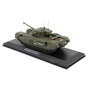 Escala 1:43: Perfeita para colecionadores e fãs de história militar, com tamanho ideal para ser exibida em qualquer lugar. Reprodução fiel do Churchill Mk.VII: Captura o design robusto e imponente do tanque real, com seu casco blindado, canhão de 75 mm, metralhadoras e suspensões resistentes. Marcas de batalha: Inclui marcas de desgaste e pintura descascada, recriando a aparência real do tanque após batalhas intensas. Detalhes realistas: Inclui antenas, faróis, escotilhas, periscopos, esteiras de borracha macia com detalhes de rolamento e marcas no solo, e decalques com o nome "Briton" e o emblema da 34ª Brigada de Tanques do Reino Unido. Torre móvel: A torre do tanque gira livremente, permitindo que você posicione o canhão em diferentes ângulos. Figura do comandante: Inclui uma figura em miniatura do comandante do tanque, vestindo uniforme militar completo da época.
