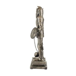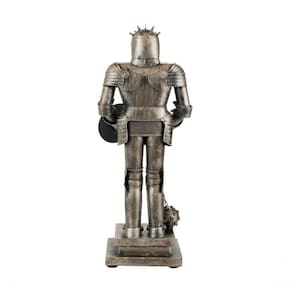 Enfeite decorativo no formato de uma armadura medieval prateada de 44.5 cm de altura com escudo redondo e um mangual. Produto exclusivamente com função decorativa. Material: metal