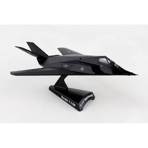 O f-117 nighthawk é um avião furtivo de ataque ao solo de assento único e bimotor operado pela força aérea dos estados unidos. sua tecnologia icônica e revolucionária permitiu que ele atacasse seus oponentes sendo praticamente indetectável. o nighthawk passou grande parte de sua vida útil envolta em sigilo, até que foi reconhecido e revelado ao mundo em novembro de 1988. Este modelo de avião de metal fundido vem em escala 1:150 com suporte de plástico e tem aproximadamente 5 1/ 2 polegadas de comprimento com 3 1/2 polegada de envergadura.
