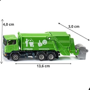 Corpo traseiro totalmente basculante para descarregar o lixo. Mecanismo de elevação funcional para a lixeira. Acompanha uma lixeira de brinquedo Siku. Pneus de borracha que garantem um deslize suave.