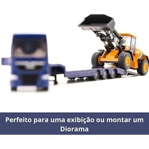 Construção: O modelo é fabricado com uma combinação de peças de metal e plástico, o que garante durabilidade e uma aparência realista. Funcionalidade: O reboque de plataforma baixa possui uma rampa de acesso que pode ser dobrada para facilitar o carregamento e descarregamento. A pá carregadeira JCB tem um braço de carregamento móvel e uma caçamba que pode ser posicionada para diversas tarefas. Detalhes: Acabamento e pintura autênticos, replicando os veículos reais. Escala: 1:87, o que a torna compatível com layouts e dioramas de ferromodelismo na escala HO.