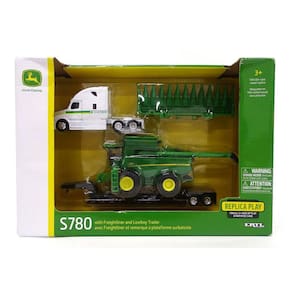 O conjunto de transporte da colheitadeira consiste em uma colheitadeira John Deere S780 1/64 com uma cabeça de milho dobrável John Deere 712FC. O semitrator Freightliner Cascadia 1/64 puxa o reboque de carroceria baixa. A colheitadeira possui corpo fundido e eixo traseiro de banda. As janelas transparentes da cabine revelam o interior detalhado. A caixa do alimentador sobe e desce. O sem-fim de descarga gira para fora para descarregar. A estrutura externa da cabeça de milho dobrável gira para cima para transporte rodoviário. O Cascadia possui capô, cabine e leito de plástico montados em um chassi fundido e o trailer lowboy possui estrutura fundida. Uma peça excepcional para o colecionador, mas feita apropriadamente para o pequeno agricultor.