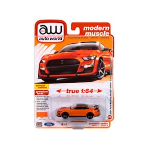 Este modelo da Auto World representa o Ford Mustang Shelby GT500 2021 na versão equipada com o pacote Carbon Fiber Track Pack, integrante da coleção Modern Muscle. Com escala 1:64 e aproximadamente 7 cm de comprimento, esta miniatura celebra a fusão entre potência extrema e engenharia leve, inspirada nas pistas.