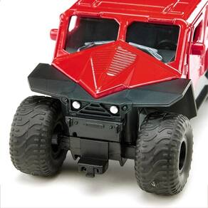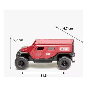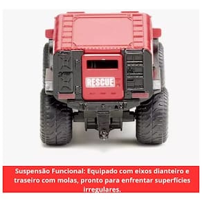 Acesso Total: As portas dianteiras e a porta traseira se abrem, revelando o interior do veículo. Operação de Resgate: Inclui uma maca de resgate que desliza para dentro e para fora do compartimento traseiro, simulando operações reais. Suspensão Funcional: Equipado com eixos dianteiro e traseiro com molas, pronto para enfrentar superfícies irregulares. Pneus Removíveis: Os enormes pneus balão podem ser destacados, adicionando mais uma camada de realismo e interatividade. Alta Versatilidade: Possui um engate de reboque traseiro, compatível com outros implementos da Siku.