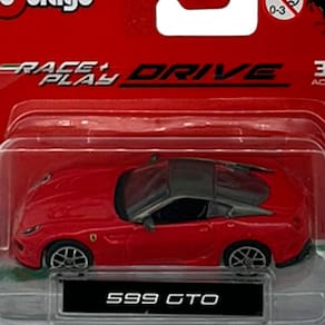 Musculatura V12 em escala compacta. A miniatura da Ferrari 599 GTO, apresentada pela BBurago na linha Racing+Play Drive, representa a versão mais radical do grand tourer 599 GTB — inspirada na 599XX e voltada para desempenho extremo com motor V12 atmosférico. Com pintura vermelho Ferrari, escala 1:64 e comprimento de 7 cm, essa réplica traz detalhes agressivos e forte presença visual mesmo em formato reduzido.