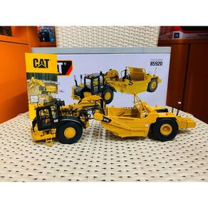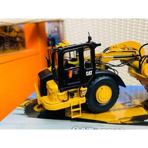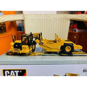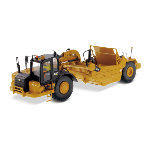 Trator de Rodas Cat 621K Série High Line - Réplica altamente detalhada do modelo fundido em escala 1:50 com pintura e decalques realistas, interior detalhado, tigela e avental totalmente ajustáveis, direção articulada e rodas giratórias autênticas e pneus de borracha.