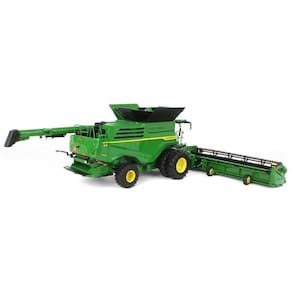 Feito por ERTL Série Prestígio Inclui uma cabeça de esteira HD45F e uma cabeça de milho dobrável C16F A cabeça da esteira com estrutura articulada possui uma barra de corte flexível, eixo helicoidal giratório e carretéis giratórios com dedos giratórios A cabeça do milho possui asas dobráveis, brocas rotativas e alimentadores finais ativos Trado dobrável Rodas dianteiras duplas Eixo traseiro giratório Escada frontal giratória Carcaça móvel do alimentador Abertura do painel lateral direito Escada suspensa
