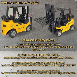 O que você vai receber em sua casa -1 empilhadeira em miniatura -1 pallet miniatura -1 caixa medidas: altura: 8,5 cm largura: 5 cm comprimento: 13 cm material: metal idade recomendada: acima de 3 anos