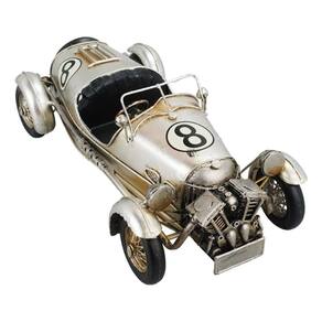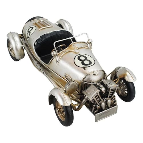Enfeite decorativo em forma de carro esportivo prateado com 10 x 30 x 14 cm de dimensão, detalhes e cores muito realista. Material: metal; Atenção: este produto tem apenas função decorativa, não é um brinquedo e nem um carro de verdade!