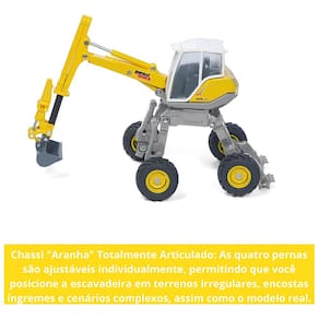 Chassi "Aranha" Totalmente Articulado: As quatro pernas são ajustáveis individualmente, permitindo que você posicione a escavadeira em terrenos irregulares, encostas íngremes e cenários complexos, assim como o modelo real. Rotação de 360 Graus: A cabine e a torre giram 360°, oferecendo total liberdade de movimento e exibição. Braço Escavador Funcional: O braço telescópico é totalmente móvel, com articulações que permitem estender, retrair e posicionar a pá com precisão. Materiais Premium: Construção robusta em metal diecast com detalhes em plástico de alta durabilidade e pneus de borracha. Pintura Autêntica: Finalizada nas cores características da Menzi-Muck, com acabamento de alta qualidade. Dimensões: Aproximadamente 18.3cm (C) x 8.2cm (L) x 16.5cm (A).