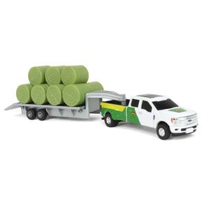 Leve a operação de transporte da sua fazenda para o próximo nível com este conjunto completo da John Deere. Produzido pela ERTL em escala 1:64, este kit inclui uma robusta caminhonete Ford F-350, um trailer funcional e 11 fardos, oferecendo uma cena completa e cheia de realismo para sua coleção ou diorama.