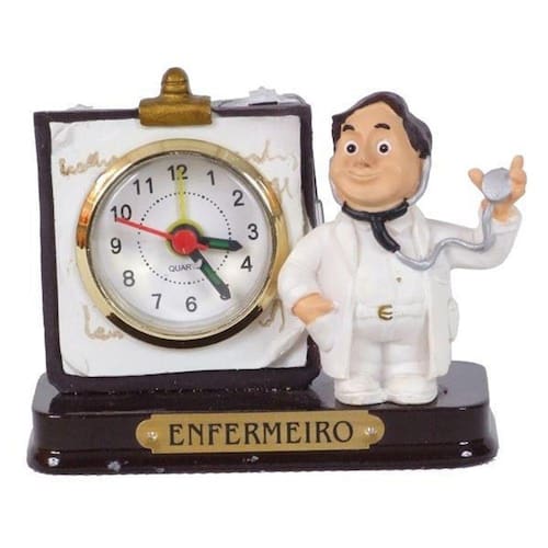 Miniatura Profissional Enfermeiro De Resina Com Relógio 8 CmCom essa miniatura de profissional enfermeiro no tamanho de 8 cm você pode presentear amigos, colegas de trabalho, formandos e profissionais em suas datas comemorativas ou ainda fazer sua própria coleção de profissionais. A peça é produzida em resina e base de madeira que deixara o ambiente ainda mais bonito. Além de decorar o ambiente essa peça tem como outra utilidade o relógio para você nunca perder a hora. Ficha TécnicaComprimento: 9 cmLargura: 4 cmAltura: 8 cmMaterial: Resina com base de madeira Marca: Meerchi