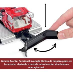 Construção Robusta: Corpo principal fabricado em metal diecast com detalhes em plástico de alta qualidade. Lâmina Frontal Funcional: A ampla lâmina de limpeza pode ser levantada, abaixada e movida lateralmente, simulando a operação real. Fresadora Traseira Móvel: A fresadora traseira Alpine-Flex é totalmente móvel, perfeita para recriar cenas de preparação de pistas de esqui. Guincho Ajustável: Possui um guincho giratório com braço ajustável, um detalhe crucial para representar operações de resgate ou ancoragem. Dimensões Fiéis: Com medidas de 19,5 cm (C) x 12,3 cm (L) x 10,3 cm (A), a miniatura mantém as proporções exatas do gigante das neves. Esteiras Realistas: Esteiras que garantem uma aparência autêntica e robusta.