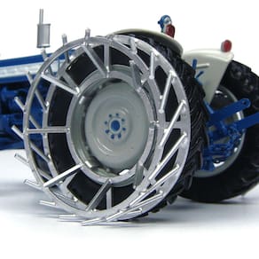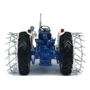 A jumelage com gaiolas de metal na parte traseira do trator Ford 5000 permite melhor aderência em terrenos difíceis. Este trator miniatura à l'échelle 1/32 foi fabricado em série limitada a 1500 exemplares.