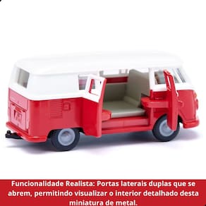 Escala de Precisão: Modelo em escala 1:50, perfeita para dioramas e coleções de veículos em miniatura. Material Robusto: Carroceria fabricada em metal fundido (diecast) de alta durabilidade, garantindo a longevidade deste item de colecionador. Design Autêntico: Pintura fiel em dois tons (geralmente vermelho e branco ou azul e branco), recriando o visual clássico da "Corujinha" ou "Bulli". Funcionalidade Realista: Portas laterais duplas que se abrem, permitindo visualizar o interior detalhado desta miniatura de metal. Pneus de Borracha: Garantem maior realismo e um acabamento superior, diferenciando-a de outros brinquedos de metal. Compatibilidade Siku: Possui engate para reboque, compatível com outros trailers e modelos Siku Super Serie, expandindo as possibilidades de brincadeira e exibição.