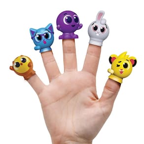 contém 5 dedoches dos personagens bolofofos - pipi, sophie, pow, bunny e rick fabricados em vinil atóxico
