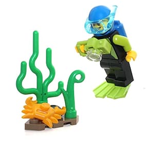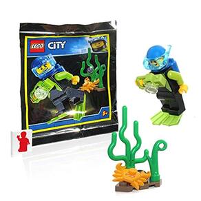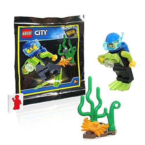 Minifigura LEGO City Cool Deep Sea Scuba Diver com caranguejo, câmera, planta e moeda (pacote metalizado de edição limitada)