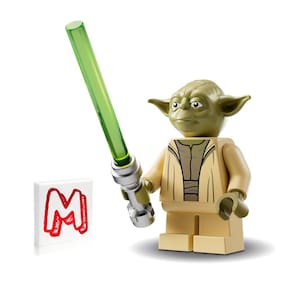 - Incluído: minifigura Yoda com sabre de luz verde trans-verde e cabo metálico e azulejo com o logotipo Cool Minifigureland!