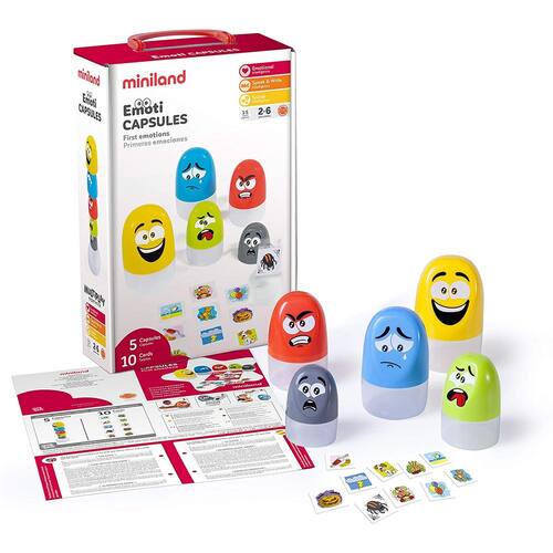 Cultive a inteligência emocional do seu filho com emoticapsules. Cada cápsula representa uma emoção - felicidade, tristeza, raiva, nojo, e temido vem completo com seu próprio conjunto de imagens e objetos ilustrativos. Usando essas ferramentas simples, as crianças podem identificar e aprender a lidar com fortes emoções. Seu design aninhado os torna fáceis de armazenar e transportar. Os produtos miniland inflamam a paixão através do jogo usando técnicas novas e criativas para promover o amor pelo aprendizado.