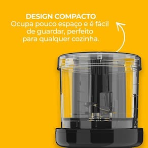 Compacto e eficiente, ideal para triturar, cortar e processar pequenas porções em segundos. Possui lâminas em inox, copo de 280ml, botão pulsar para controle e trava de segurança.Acessórios