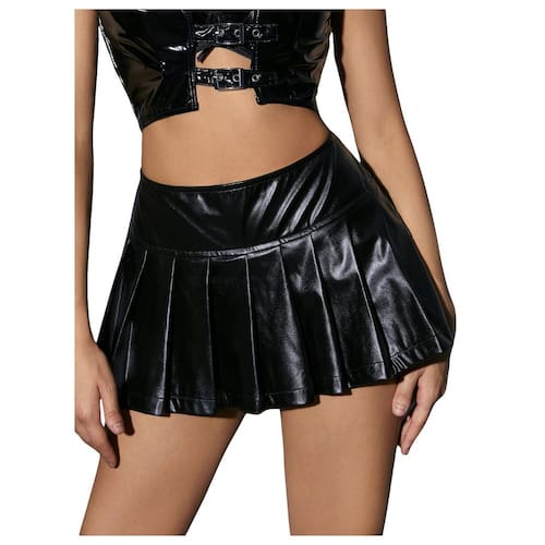 - Característica: esta minissaia plissada com design de couro que mantém você fresca e charmosa em climas quentes, prolonga o comprimento da perna