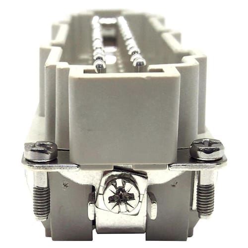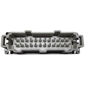 Esse miolo possui 24 pinos e é do tipo conector inserto, com gênero macho. Sua terminação é feita por parafuso, garantindo uma conexão segura e estável. Com uma tensão nominal de 500v e corrente nominal de 16A, esse miolo é capaz de suportar altas cargas elétricas.