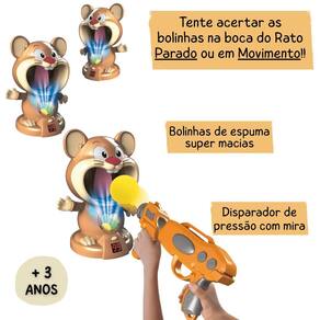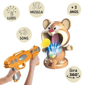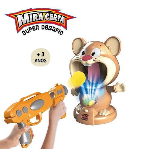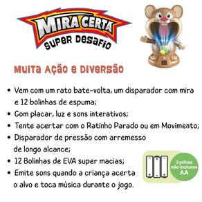 Prepare-se para muita diversão e desafios com o Certa - Super Desafio Interativo Ideal para crianças a partir de 3 anos, esse brinquedo promete horas de entretenimento com um jogo cheio de luzes, sons e emoção. O objetivo é simples e empolgante: acertar as bolinhas de espuma na boca do ratinho - que pode estar parado ou em movimento girando em 360 Com um disparador com , o brinquedo garante arremessos de longo alcance e muita adrenalina. O ratinho bate e volta, possui placar digital, luzes e sons interativos, e ainda toca musiquinhas durante o jogo, deixando a brincadeira muito mais envolvente Quando a criança acerta o alvo, o rato emite som comemorativo e marca os pontos no display. As 12 bolinhas de espuma EVA são super macias e seguras, ideais para brincadeiras dentro de casa. Uma ótima opção de presente criativo e educativo que estimula coordenação motora, e concentração, com toda a segurança e alegria que os pequenos merecem Funciona com 3 pilhas AA não inclusas Dimensões aproximadas: Rato: 19,5 x 26 x 14 cm Disparador: 35 x 15 x 5 cm Marca: Não Informado
