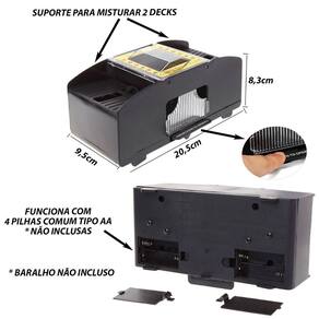 Este embaralhador misturador suporta 2 decks de cartas e realiza a mistura em segundos. É ideal tanto para uso amador quanto profissional, sendo uma excelente opção para quem não sabe embaralhar ou tem dificuldade.