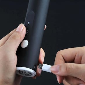 Alimentação: Carregamento USB Material: plástico, aço inoxidável e componentes eletrônicos Dimensões: 31cm altura com fouet conectado