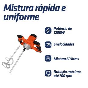 Principais Características e Informações Técnicas Modelo: Misturador de Tintas e Argamassas STIR1200 Marca: Intech Machine Voltagem: 220V Potência: 1200W Velocidades: 6, variáveis até 700 rotações por minuto (RPM) Capacidade Máxima: Mistura até 60 litros Conexão: Rosca padrão M14 x 2 mm Acessórios Inclusos: 1 Haste de 59cm e 1 Impelidor (hélice) tipo fita helicoidal de 12cm de diâmetro Peso: 6 kg Principais Aplicações: Mistura de tintas, argamassa, rejunte, massa corrida, chapisco, cola para piso e produtos similares. Vantagens: Maior compatibilidade com instalações industriais e de maior potência, homogeneidade total, agilidade no trabalho e redução de retrabalho.