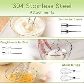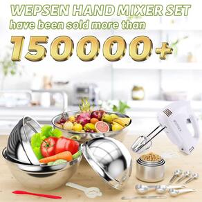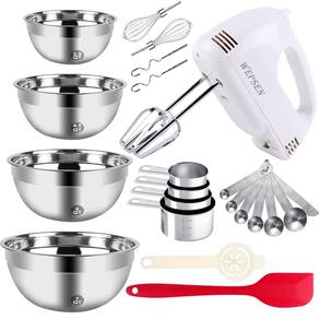 - ? Misturador portátil com tigelas para assar: esta é uma combinação versátil, um ótimo utensílio de cozinha para assar, cozinhar, servir, misturar e preparar. Este conjunto de itens essenciais de cozinha inclui uma batedeira elétrica portátil com 4 acessórios (batedores de balão, batedores, ganchos de massa), 4 tigelas de mistura, 4 copos medidores de aço inoxidável, 7 colheres de medição de aço e outras ferramentas de cozimento. Todos os acessórios de aço inoxidável podem ser lavados na máquina de lavar louça e na geladeira.