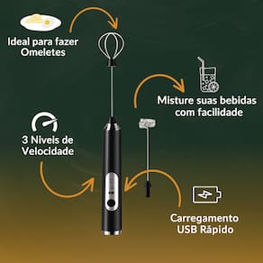 Misturas Perfeitas e Sem Grumos: Com 3 velocidades ajustáveis (6000/7000/8000 RPM), ele bate seus shakes e vitaminas, eliminando completamente os grumos e deixando sua bebida com a textura ideal. Portátil e Sem Fio: Com uma bateria de 1500mAh recarregável via USB, você pode levá-lo para a academia, escritório ou viagens. Basta carregar e usar! Dois Batedores Versáteis: O kit inclui dois batedores: um fouet para bater ovos e misturar massas leves e uma mola para espumar leite, bebidas cremosas e shakes. Fácil de Usar e Limpar: A operação é feita com um único botão e o corpo em aço inoxidável 304 é durável, resistente e muito fácil de higienizar.