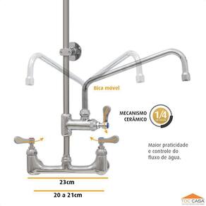 A torneira de bica móvel alta possui arejador fixo que produz um jato direcionável com giro de 360;
