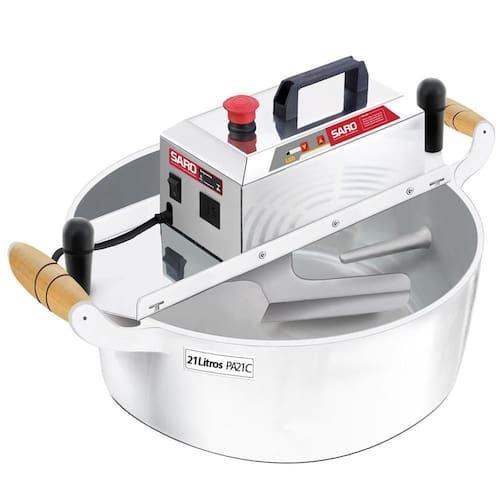 Ideal para preparar variados tipos de doces e massas e também a única com regulador de velocidade digital. Economize seu tempo e torne-se profissional com este equipamento. Este equipamento é o único com led indicativo que lhe ajuda a monitorar a velocidade do equipamento, além da temperatura e esforços demasiados grandes. Sempre que o equipamento detectar alguma anomalia ou esforço muito grande, começará a piscar e lhe avisará que algo não anda bem. Conteúdo da embalagem: 1 Misturela 1 Manual de instruções Cor: Inox Linha: Profissional Modelo: Cozedeira Tipo: Elétrica Material: Aço carbono Material da panela: Alumínio fundido Voltagem: Bivolt Potência: 1/3 cv Frequência: 50 - 60 Hz Capacidade: 21 litros Possui timer sonoro: Sim Possui sistema de segurança: Sim Possui regulador de velocidade: Sim Tipo de timer: Digital Tipo de sistema: Red plus Tipo de carenagem: Slim Aplicação: Doces, brigadeiros, doces de leite, cocadas e etc Referência: PA21C Marca: Saro Conteúdo da embalagem: 1 Misturela Dimensões aproximadas do produto: 35 x 45 x 45 cm A x L x C Dimensões aproximadas da embalagem: 40 x 50 x 50 cm A x L x P Peso aproximado do produto: 10 Kg Peso aproximado da embalagem: 11 Kg Informações Adicionais: Não possui fogareiro Ean: 7026537581365