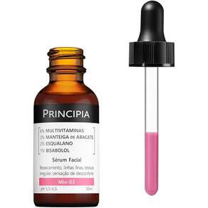 O Principia Sérum 6% Multivitaminas + 3% Manteiga de Abacate + 2% Esqualano + 1% Bisabolol Principia Skincare Mix-03 é um sérum multirreparador desenvolvido para promover hidratação, melhorar a textura da pele, suavizar linhas finas e acalmar a pele sensibilizada. Sua fórmula avançada é ideal para cuidados noturnos, oferecendo ação antioxidante e nutritiva, além de suavizar vermelhidões e desconfortos.