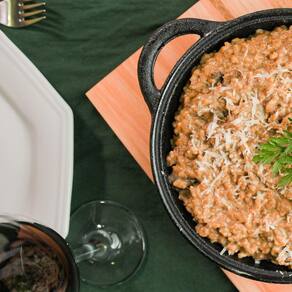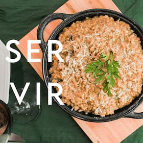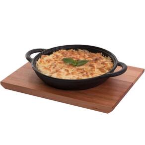 Mix Grill para Risoto e Parmegiana Kort Panela de Ferro Fundido 22cm e Base de Madeira Retangular.