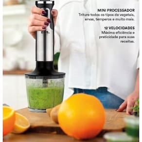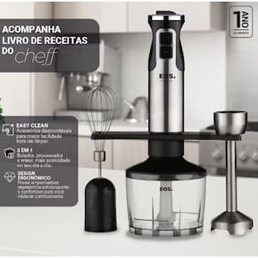 Mixer 3 em 1 EOS com potência de 850W, 12 velocidades, acessórios removíveis para limpeza, processador de 250g e design em inox.Acompanha copo