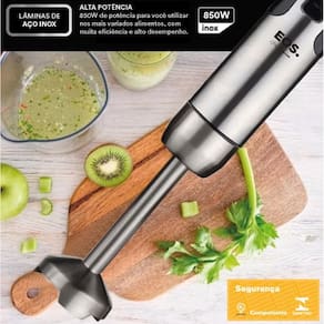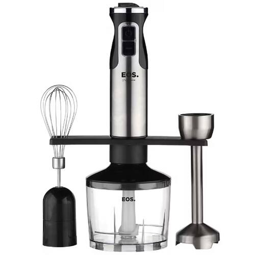 Mixer 3 em 1 EOS com potência de 850W, 12 velocidades, acessórios removíveis para limpeza, processador de 250g e design em inox.Acompanha copo