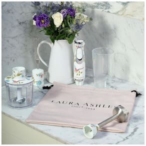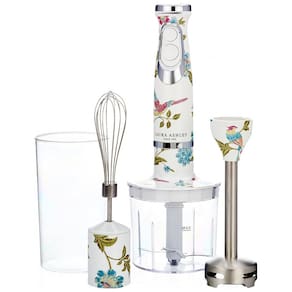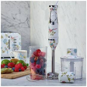 A solução 4 em 1 inclui haste de mistura em inox, batedor, recipiente picador e copo medidor/pouring cup de 300ml. Todos os acessórios removíveis são laváveis em lava-louças, facilitando a limpeza. O design ergonômico traz acabamento branco com estampa floral Elveden aplicada manualmente, agregando sofisticação à cozinha.