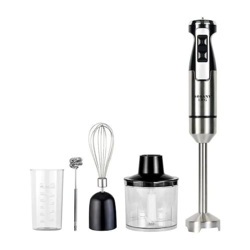 5 em 1: mixer, mini processador, batedor de claras, espumador de leite e copo medidor. Lâmina de aço inoxidável. Design ergonômico. Fácil de limpar.Acompanha copo