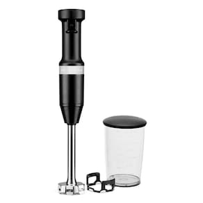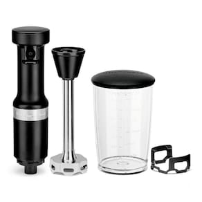 Marca: KitchenAid Modelo: keb53apana Material: Aço Inox e ABS Cor: Black Matte Altura: 41,4cm Largura: 6,35cm Profundidade: 9,06cm Peso: 0,94kg Potência: 180w Voltagem: 110v Capacidade: 700ml Funções: Triturar, Misturar e Liquefazer. Conteúdo da embalagem: 1 Mixer, 1 copo de 700ml livre de BPA e 1 protetor de panelas. Garantia: 12 meses