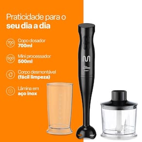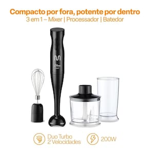 Mixer 3 em 1: Mixer, mini processador e batedor de claras. Potência de 200W. 2 velocidades -Duo Turbo-. Lamina em aco inox. Corpo desmontavel.Acompanha copo
