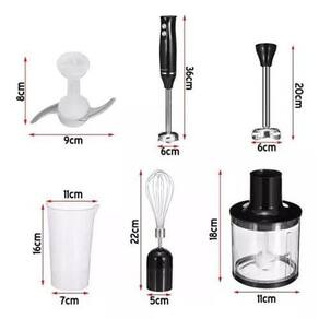 Mixer 4 em 1 com 500W de potência, inclui mixer, batedor, picador e triturador. Lâminas de aço inoxidável, design ergonômico, peças removíveis e compatíveis com lava-louças.
