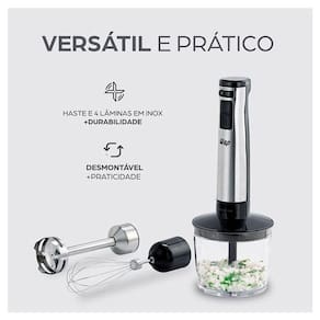 Mixer 3 em 1 (mixer, miniprocessador, batedor de claras), haste e lâminas em aço inox, design ergonômico e desmontável.Acompanha copo