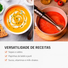 Equipado com um motor robusto de 500W de potência e a exclusiva função turbo, ele tritura até os alimentos mais consistentes com uma rapidez impressionante. O grande diferencial deste modelo é a sua haste e lâmina em aço inox, que oferecem resistência superior e permitem o uso seguro diretamente em preparos quentes no fogão, sem o risco de manchas ou retenção de odores. Além disso, seu design ergonômico e corpo desmontável garantem um manuseio confortável e uma limpeza rápida após o uso.