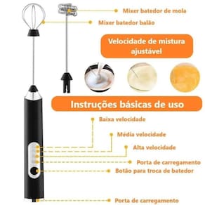 Mixer portátil recarregável com motor de alta performance, 3 velocidades, batedor tipo fouet, corpo em aço inoxidável, carregamento USB bivolt, bateria interna de longa duração.Acompanha copo