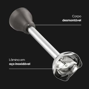 O corpo desmontável facilita o encaixe dos acessórios e a limpeza do aparelho, tornando o processo mais prático. Além disso, o mixer acompanha um copo dosador, auxiliando no preparo e na medida exata dos ingredientes, fouet para bater ovos e massas leves, e processador para 400mL.